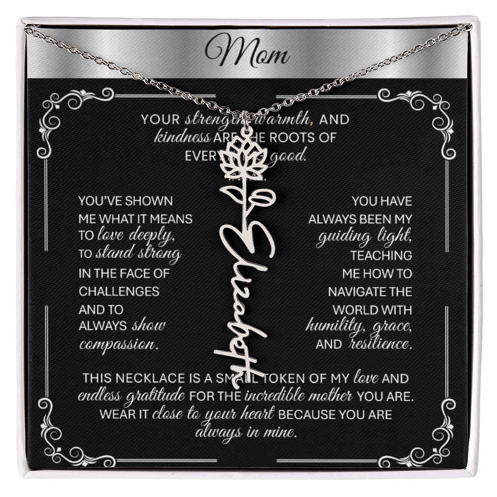 Each necklace features your mom's name artistically integrated into a delicate floral design, available in a luxurious 18K gold-plated option. A unique expression of her individuality and style.